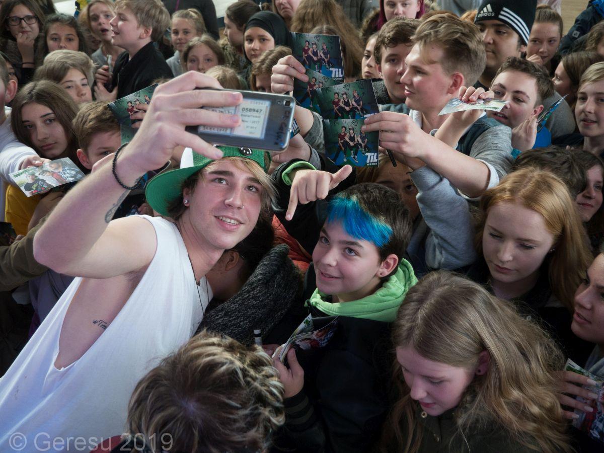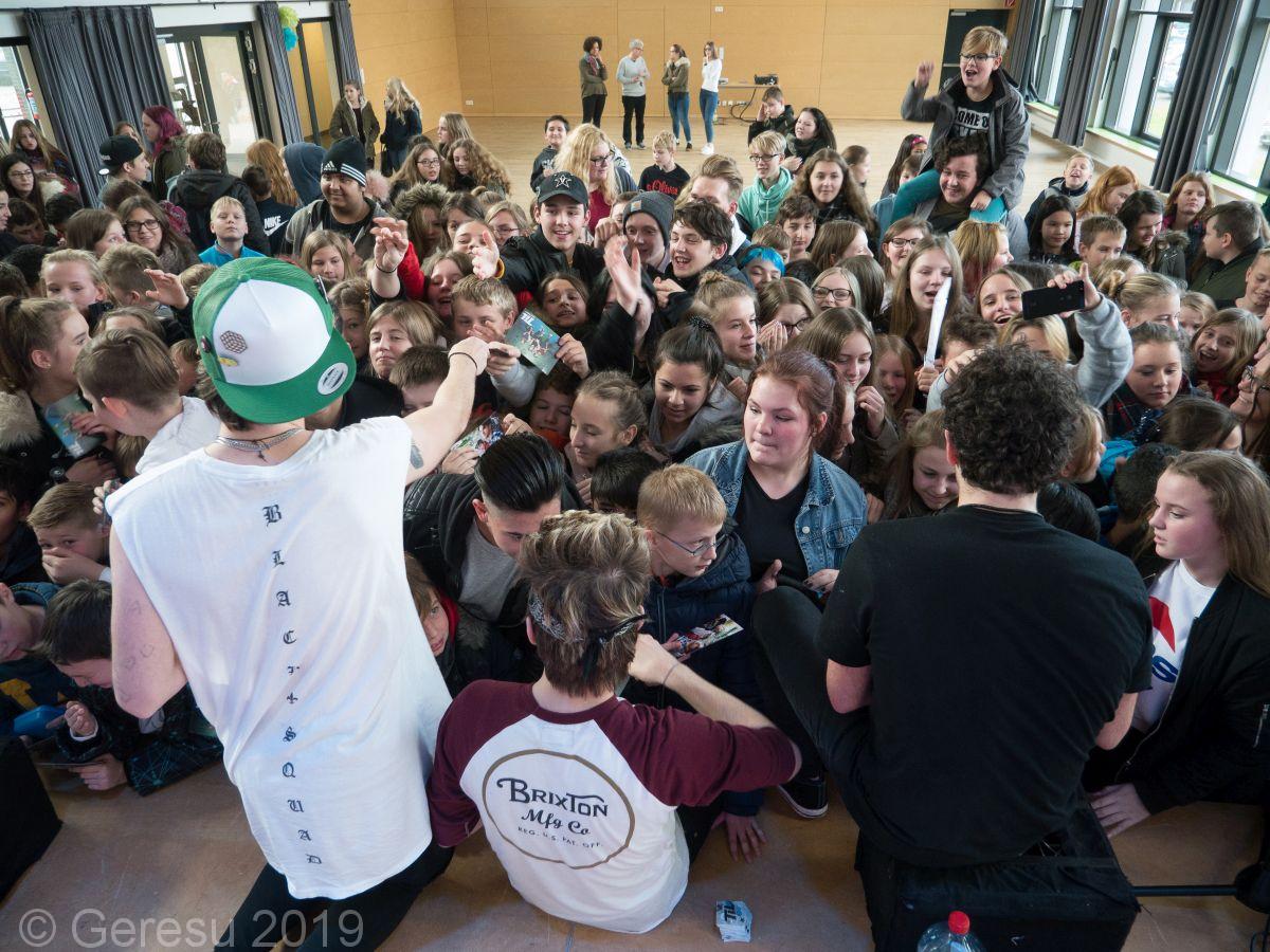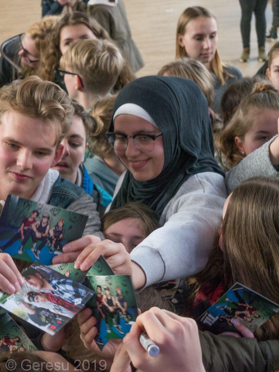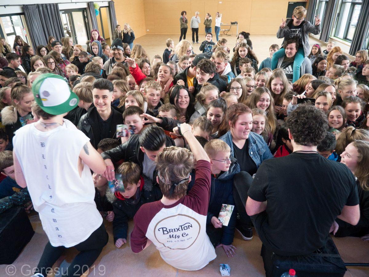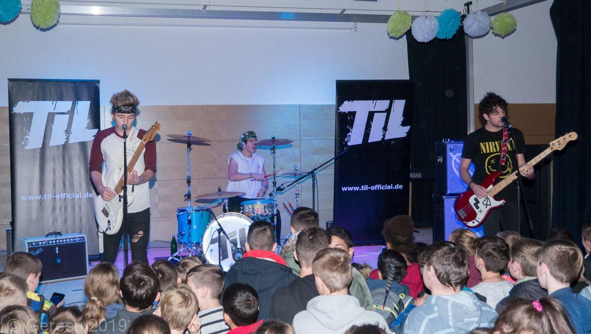 Schon nach wenigen Takten tobte der Saal. Die Newcomer Band Til tobte über die Bühne der Gesamtschule Suderwich Geresu und machte aus rund 600 Schülerinnen und Schülern begeisterte Fans. Im Rahmen ihrer Tournee durch deutsche Schulen kamen die drei Jungen aus Wenden in Westfalen am 6. November 2017 an die Suderwicher Markomannenstraße. Dennis, Enis und Jona zogen bei diesem Konzert während der großen Pause von Anfang an alle Register. Mit voller Power vom Bass, Schlagzeug und E-Guitarre brachten sie den Saal zum Kochen. Und immer wieder die Frage von Enis: „Geht’s euch gut?“ Und ohrenbetäubend kommt zurück. „Jaaaaaa!“ Als die drei Jungen nach 20 Minuten die Instrumente weglegen wollten, kamen sie nicht ohne Zugabe von der Bühne. Und noch einmal erklang ihr aktueller Titel „Brand new Life“, mit dem die drei sympathischen Newcomer die Charts erobern wollen. Und dafür haben sie gute Chancen, denn nach dem Konzert standen hunderte begeisterter Fans im Pulk vor der Bühne auf der Jagd nach Autogrammen und Stickern. Musiklehrerin Josephine Beck, die mit der Fachschaft Musik das Konzert organisiert hatte, freute sich über diese „etwas anderen“ Musikunterricht.