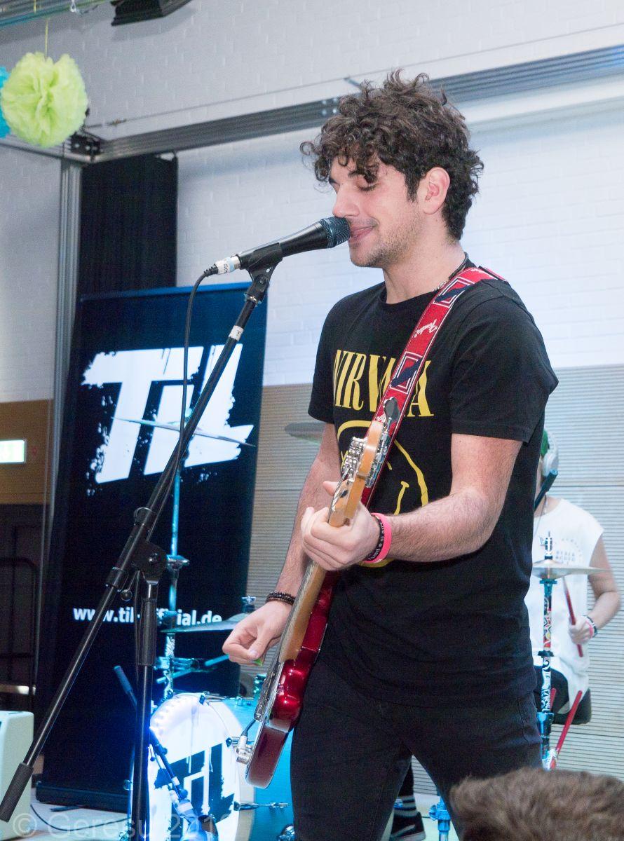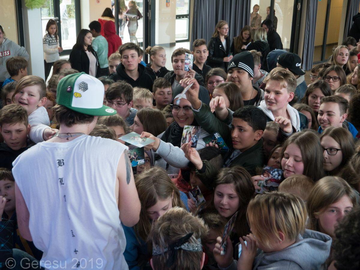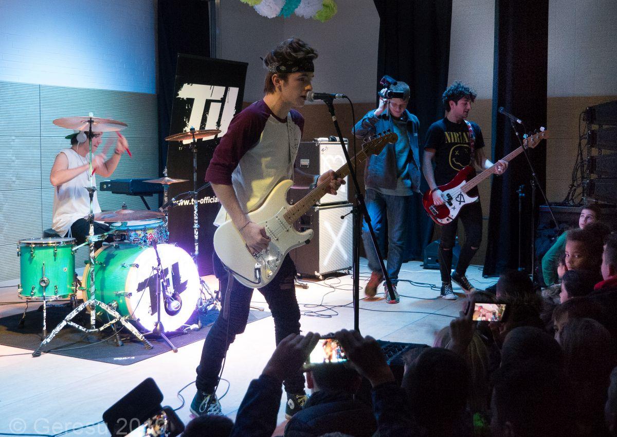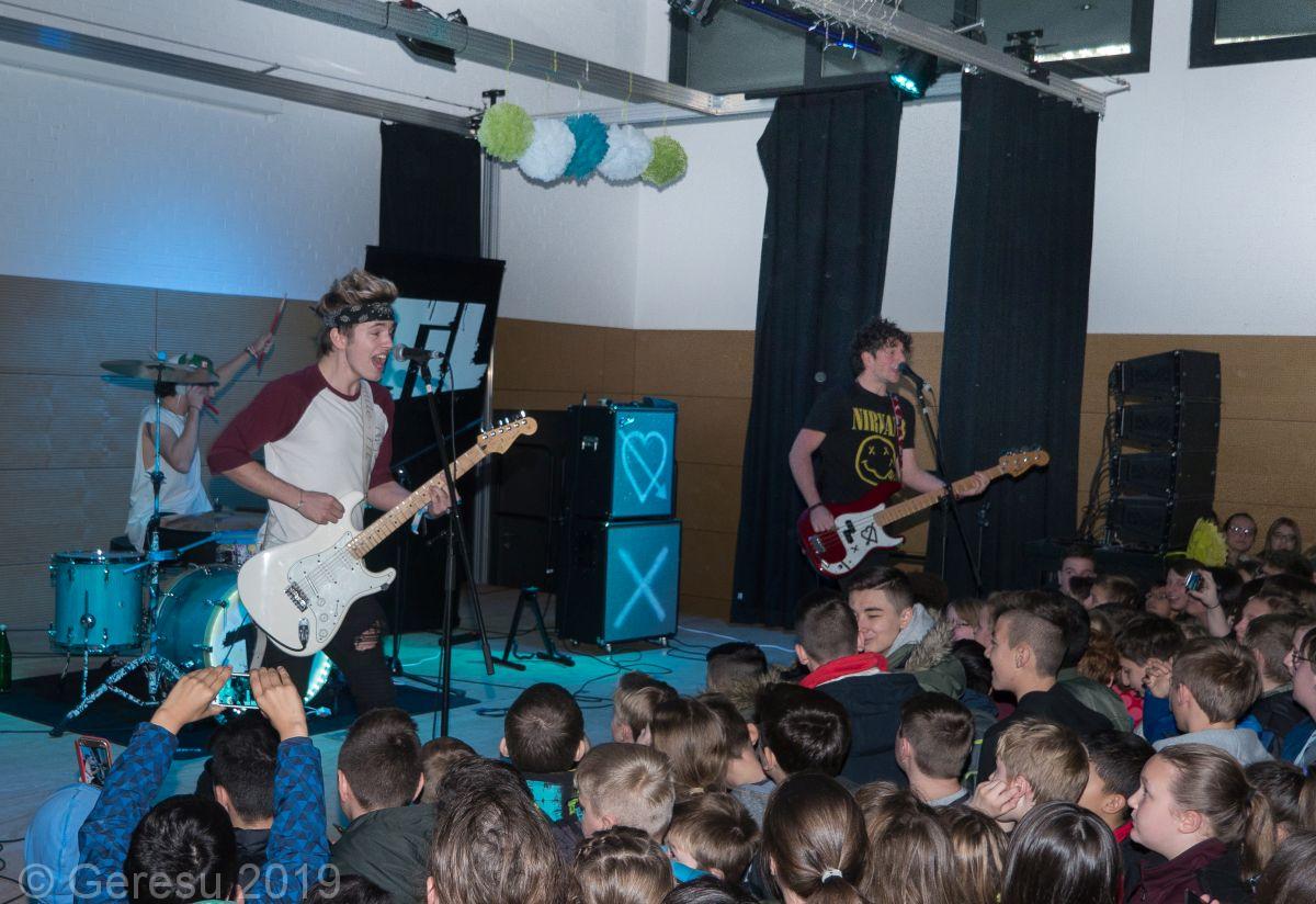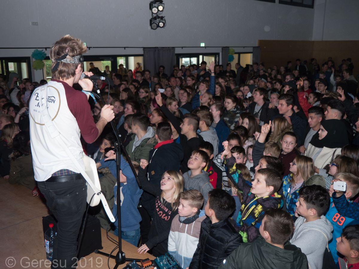 Schon nach wenigen Takten tobte der Saal. Die Newcomer Band Til tobte über die Bühne der Gesamtschule Suderwich Geresu und machte aus rund 600 Schülerinnen und Schülern begeisterte Fans. Im Rahmen ihrer Tournee durch deutsche Schulen kamen die drei Jungen aus Wenden in Westfalen am 6. November 2017 an die Suderwicher Markomannenstraße. Dennis, Enis und Jona zogen bei diesem Konzert während der großen Pause von Anfang an alle Register. Mit voller Power vom Bass, Schlagzeug und E-Guitarre brachten sie den Saal zum Kochen. Und immer wieder die Frage von Enis: „Geht’s euch gut?“ Und ohrenbetäubend kommt zurück. „Jaaaaaa!“ Als die drei Jungen nach 20 Minuten die Instrumente weglegen wollten, kamen sie nicht ohne Zugabe von der Bühne. Und noch einmal erklang ihr aktueller Titel „Brand new Life“, mit dem die drei sympathischen Newcomer die Charts erobern wollen. Und dafür haben sie gute Chancen, denn nach dem Konzert standen hunderte begeisterter Fans im Pulk vor der Bühne auf der Jagd nach Autogrammen und Stickern. Musiklehrerin Josephine Beck, die mit der Fachschaft Musik das Konzert organisiert hatte, freute sich über diese „etwas anderen“ Musikunterricht.