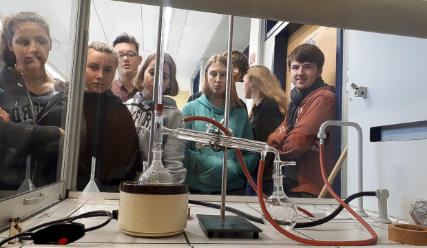 „Jeder nor einen wönzigen Schlock.“ Nicht nur die ältere Generation kennt dieses zum Sprichwort gewordene Zitat von Lehrer „Schnauz“ aus dem Film die Feuerzangenbowle. Nach seinem Vortrag über die alkoholische Gärung begann einer der bekanntesten Schülerstreiche der Filmgeschichte, als die ganze Klasse vorgab, sturzbetrunken zu sein. In diese Fußstapfen wollten die Schülerinnen und Schüler des Chemie E-Kurse der Klasse 10a natürlich nicht treten. Aber die Herstellung von Wein und destilliertem Alkohol interessierte die Jugendlichen trotzdem. Unter der Anleitung von Lehrerin Doris Godde wurden Anfang Dezember 2017 zunächst Weintrauben zerquetscht und durch ein Küchentuch gedrückt. Ein wenig Bierhefe setzte die Gärung in Gang. Eine Woche später wurde die Brühe in einem Glaskolben erhitzt, der entstehende Dampf abgekühlt und die so entstehende Flüssigkeit aufgefangen. Schon allein der Duft verriet es: Hier war ein hoher Alkoholgehalt entstanden. Die Jugendlichen beließen es beim Schnuppern. Probieren wollte und durfte keiner.