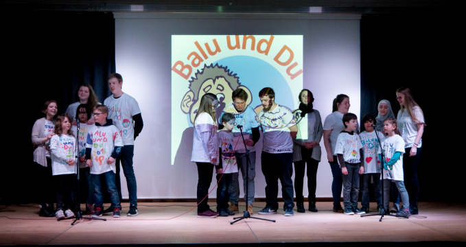 Ein wenig Lampenfieber hatten die kleinen Moglis schon, als sie zu ihren Balus auf die Bühne stiegen. Bei der abschließenden Präsentation der Projektkurse hatten die kleinen Grundschüler an der Hand ihrer jugendlichen Begleiter ihren großen Auftritt. Gemeinsam sangen sie – frei nach Disney – das Balu-Lied aus dem Dschungelbuch mit einem neuen Text. Ein Jahr lang hatten Schülerinnen und Schüler aus der Q2 (Jahrgang 13) je ein Kind aus der Astrid-Lindgren- oder der Anne-Frank-Grundschule betreut und regelmäßig zu Freizeitaktivitäten eingeladen. Da wurden Kürbisse geschnitzt, Laternen gebastelt, T-Shirts bemalt, Kostüme gestaltet oder Weihnachtkekse gebacken. Die kleinen Schützlinge erhielten durch ihre großen Begleiter viele Anregungen für die Freizeitgestaltung. Balu und Du ist ein bundesweites Programm, welches von der Benckiser Stiftung Zukunft getragen und in Recklinghausen neben anderem von Gelsenwasser unterstützt wird. Der Kurs an der Geresu wurde geleitet von Lehrerin Melina Friedriscyk.