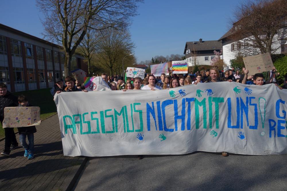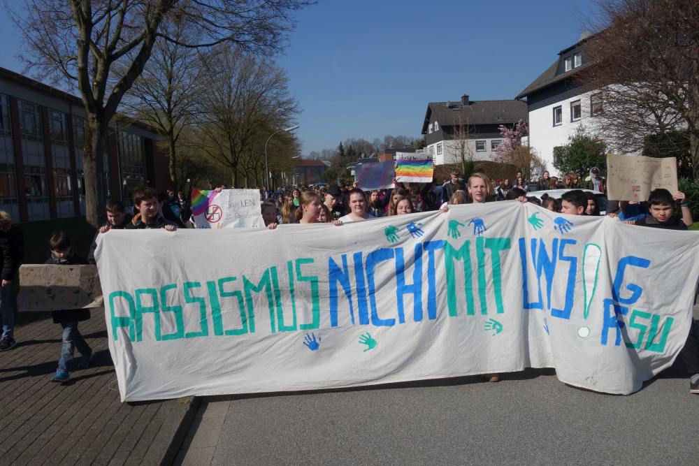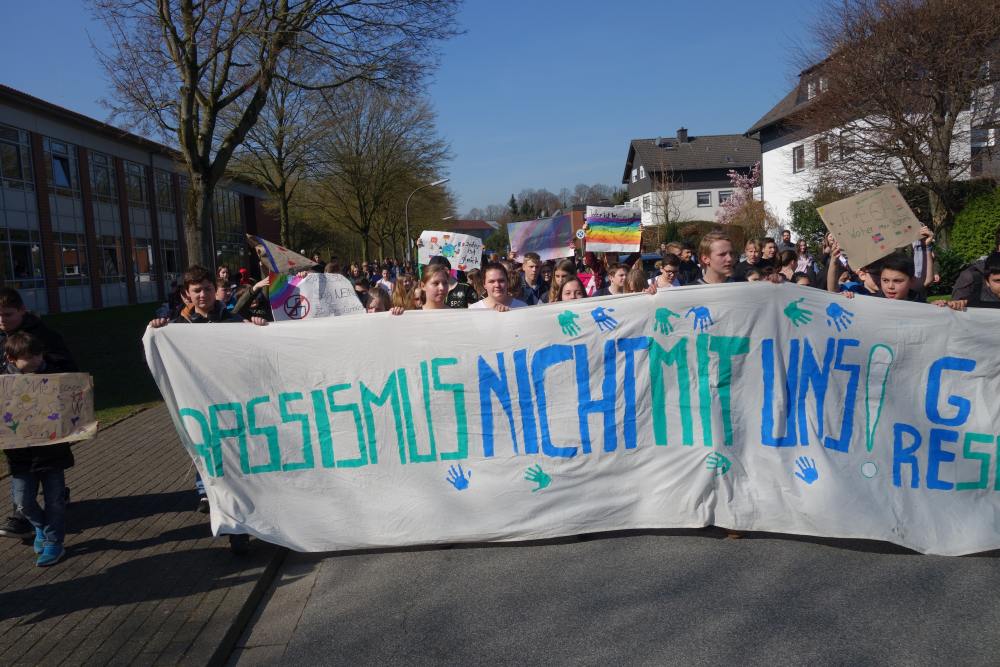 Ein eindrucksvolles Bild. 200 Schülerinnen und Schüler zogen am 21. März gemeinsam mit ihren Lehrerinnen und Lehrern durch die Suderwicher Straßen, um mit Transparenten und Sprechchören gegen Rassismus und Ausgrenzung zu demonstrieren. Bereits im vergangenen Jahr waren die Jugendlichen für ihr solidarisches Anliegen auf die Straße gegangen. Auch dieses Mal wurde die gesamte Demonstration erneut von Gesamtschülerinnen und -schülern der Gesamtschule Suderwich organisiert. Sie verfassten die Einladungen für die Mitschüler, stellten das Projekt der Schülervertretung vor, meldeten die Demonstration bei der Polizei an und gestalteten die Banner. Bei der Regionaltagung des bundesweiten Wettbewerb „demokratisch handeln“ im Februar hatte eine Schülerdelegation zusätzlich die Gelegenheit, das Projekt der NRW-Schulministerin Gebauer vorzustellen. Besonders erfreut waren die jungen Aktivisten über die diesjährige Beteiligung des Marie-Curie-Gymnasium Recklinghausen und der Gesamtschule Dortmund Scharnhorst. Die Veranstaltung begann mit einem Vorprogramm in der Aula an der Markomannenstraße. Danach startete der Demonstrationszug von zu einem einstündigen Umzug durch den Recklinghäuser Vorort. „Die Idee zu der Demonstration ging vor einem Jahr von Fabienne aus dem damaligen 6. Jahrgang aus“, berichtet Matthias Flüß, der als Lehrer die Aktion begleitete. Im GL-Unterricht sprachen die Jugendlichen über Unterdrückung und Rassismus. Fabienne empörte sich: „Da müssen wir gegen streiken.“ Und erntete spontanen Beifall aus der Klasse. Flüß nahm die Klasse beim Wort und ermutigte die Heranwachsenden, eine Demonstration zu organisieren. Die Aktion soll nun zur festen Tradition der Gesamtschule Suderwich werden.
