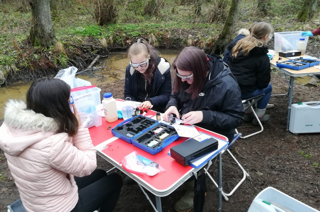 Einen ungewöhnlichen Lernort suchte im April 2019 der Biologie-Leistungskurs der Jahrgangsstufe 12 (Q1) auf. Bei kühler Witterung und reichlich Niederschlag unternahmen die jungen Forscher eine Exkursion zur Forschungsstation Heidhof in Bottrop Kirchhellen. Am dortigen Schwarzbach analysierten dir Gruppe unter der Leitung von Fachlehrer Thiemo Gillar die Wasserqualität nach gewässerökologischen Kriterien. Ziel war es anhand der Vermessung und der chemischen Gewässeranalyse zu bestimmen, ob der Bach noch naturbelassen ist oder durch Industrialisierung und Landwirtschaft beeinträchtigt. Ferner wurden natürlich vorkommende Insekten eingefangen und bestimmt.