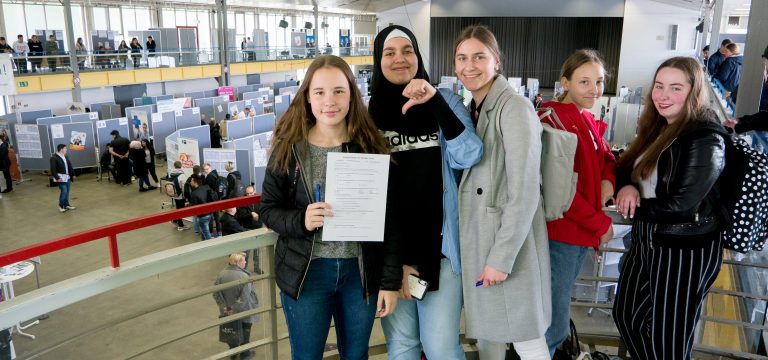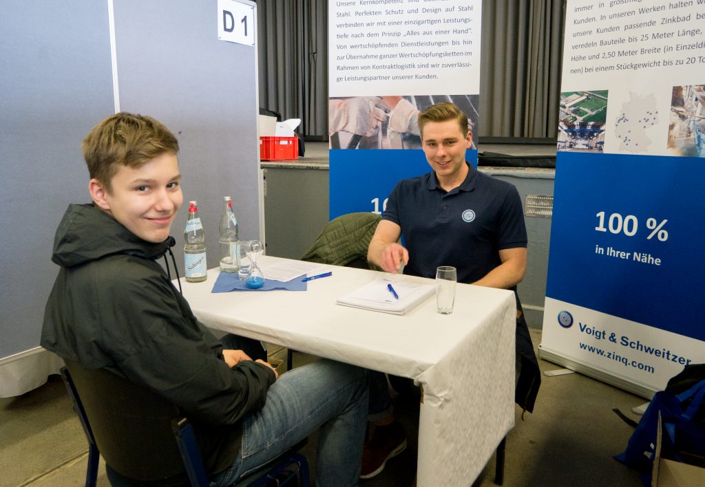 Ein wenig Mut brauchten die Jugendlichen aus dem 9. Jahrgang der Geresu schon, wenn sie sich beim IHK-Azubi-Speed-Dating erstmals in ein echtes Vorstellungsgespräch wagten. Zum 8. Mal hatte am 22. Mai die IHK Nordrhein-Westfalen in die Vestlandhalle eingeladen zu einer Berufemesse der besonderen Art. In zahlreichen Kojen saßen die Personalverantwortlichen vieler Firmen aus der Region und boten den jungen Bewerberinnen und Bewerbern zehnminütige Vorstellungsgespräche unter realen Bedingungen an. Mit etwas Glück und dem richtigen Auftritt konnten sich auch einige Jugendliche sofort einen Ausbildungsplatz sichern. An anderer Stellen checkten Berufsberater die mitgebrachten Bewerbungsschreiben und gaben wertvolle Tipps zur optimalen Gestaltung der notwendigen Unterlagen. Ein Fotograf fertigte auf Wunsch kostenlos Bewerbungsfotos an. Auf jeden Fall: Wer Mut hatte, wurde belohnt mit wichtigen Anregungen für die Bewerbung und die Berufswahl. Selbst wenn am Ende die Erkenntnis stand, dass die ursprüngliche Berufsidee noch mal überdacht werden sollte.