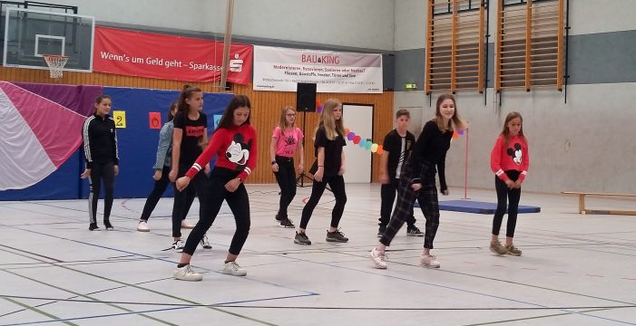Der Spaß am Tanz und an der Bewegung stand im Mittelpunkt des 16. Tanzfestes „Hits für Kids“ am Tag des Schulsports, 4. Juni 2019. Die Geresu war gleich mit zwei verschiedenen Tanzgruppen in der Walter-Lohmar- Sporthalle dabei. Die Modern Dance AG unter der Leitung von Lara und Josie Winhauer zeigte einen Auschnitt aus ihrem inzwischen umfangreichen Repertoire. Erstmals trat in diesem Jahr die AG „Orientalische Tänze“ vor das Publikum. Dabei hatte die dreiköpfige Gruppe mit erschwerten Bedingungen zu kämpfen. Die Leiterin und Vortänzerin Acelya Akcan aus dem 10. Jahrgang war einen Tag vorher erkrankt und so mussten die Fünftklässlerinnen Carina, Elmeana und Josefine den Auftritt alleine bewältigen. „Was super geklappt und das ganze Publikum zum Mitklatschen gebracht hat“, freut sich die begleitende Lehrerin Stephanie Brier.