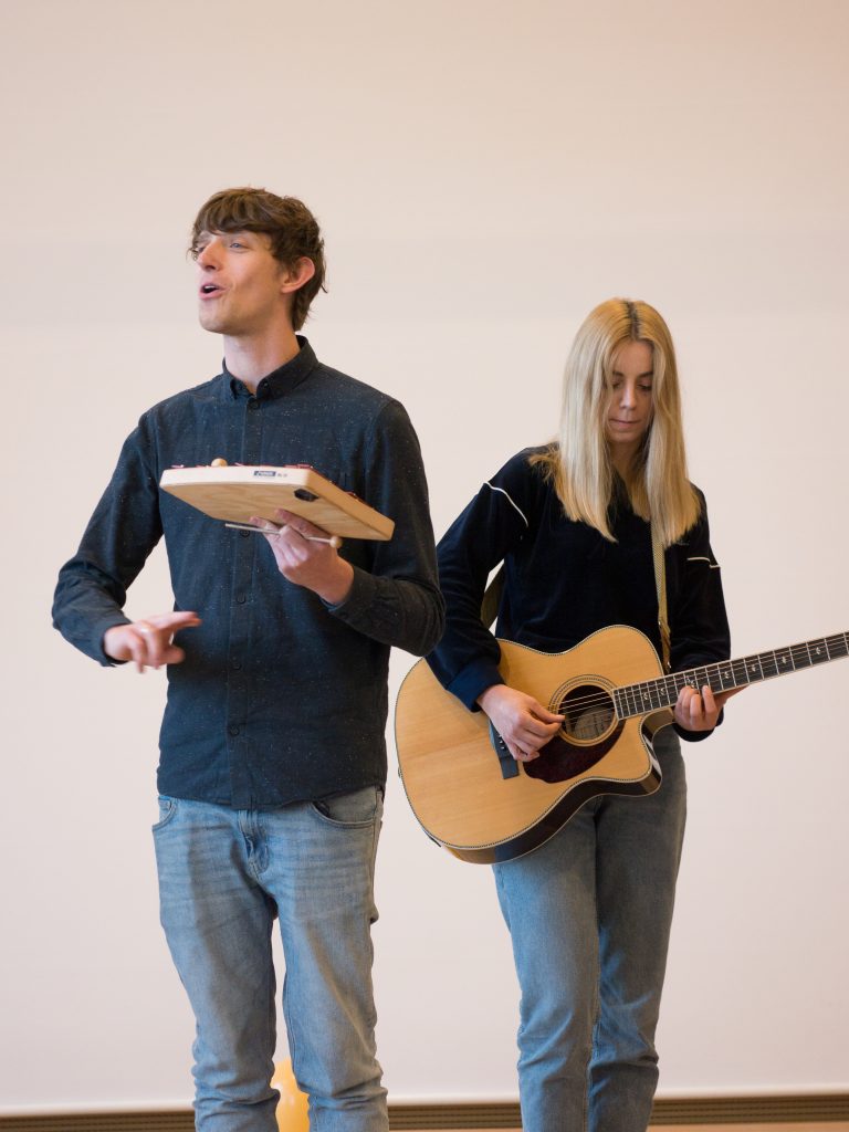 Überraschungsgast und Pate der Aktion war die bekannte Indiepop-Band Tonbandgerät aus Hamburg, die ihre Deutschlandtournee auf Einladung von Matthias Flüß unterbrochen hatten, um einem kurzen Abstecher nach Suderwich zu unternehmen. Ole Specht, Sänger der Gruppe, lobte das Engagement der Jugendlichen. „Macht weiter so.“ Zum Programm des kurzen Unplugged Auftritts gehörte natürlich auch der Titel „Lange her“, den die Gruppe vor zwei Jahren für das Demokratieprojekt Demotapes aufgenommen hatte. Zuvor hatten Anna-Lisa und Elaine aus dem 8. Jahrgang selbst verfasste zusätzliche Strophen zu dem Lied vorgetragen.