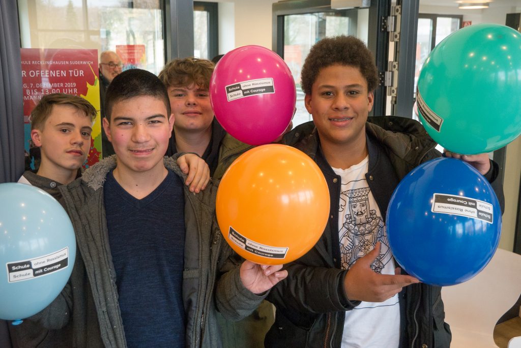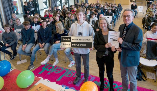 Jetzt ist es klar und unmissverständlich: Die Gesamtschule Suderwich ist eine „Schule ohne Rassismus“. In einer Feierstunde 5. Dezember 2019 überreichte Wolfgang Krämer, Leiter des Integrationszentrums im Kreis Recklinghausen, die begehrte Plakette an Schulleiterin Karin Holtbrügge. Leo Skoda und Justin Sommer, inzwischen ehemalige Schüler der Geresu, sammelten im Frühjahr die notwendigen Unterschriften für die Erlangung des Zertifikates. Matthias Flüß, der gemeinsam mit Lehrer-Kollege Yilmaz Gökcen, die Aktion betreute, wandte sich mit eindringlichen Worten an die Schulgemeinschaft. Die Plakette sei nicht nur eine Auszeichnung, sondern vor allem eine Verpflichtung, nicht wegzuschauen, wenn Mitglieder der Schulgemeinschaft von Ausgrenzung oder Rassismus betroffen sein sollten.