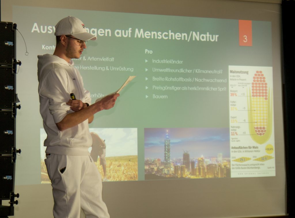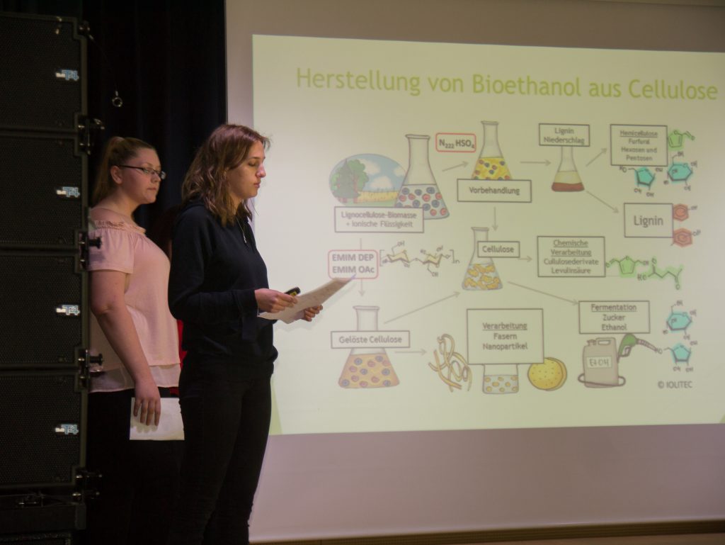 Ein wissenschaftlicher Vortrag muss nicht immer trocken und langweilig sein. Mit viel Elan und Humor boten Jonas Wiener und Simon Schniederjahn aus der Q2 einen echten Science-Slam und verrieten ganz nebenbei die Geheimnisse der Herstellung von Bioalkohol durch die alkoholische Gärung. Die Vorlage für den Vortrag hatten sie zuvor gemeinsam mit Jonas Schulz (Powerpoint) und Lisa Kodat (Fakten) erarbeitet. Schauplatz des Slams war die Präsentation der Ergebnisse aus den drei Projektkursen der baldigen Abiturienten. Green Chemistry hieß der Kurs von Lehrer Thiemo Gillar, der sich ein Jahr lang mit der Produktion nachhaltiger Treibstoffe beschäftigte. In weiteren Vorträgen zum Thema erfuhr das Publikum aus Schülerinnen und Schülern der Oberstufe die technischen Voraussetzungen, die wirtschaftlichen Aspekte und die ökologischen Auswirkungen von Bioalkohol als möglichen Brennstoff der Zukunft.