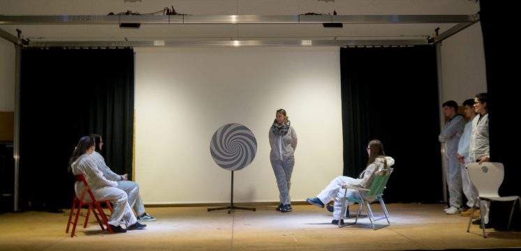 Vom Corona-Virus ausgebremst muss der dritte der Projektkurse leider vorerst auf die Vorstellung des wichtigsten Ergebnisses ihrer einjährigen Arbeit verzichten. Der Kurs „Wider das Vergessen“ hatte unter der Leitung von Mike Kochstädt und Matthias Ermisch einen alternativen Stadtrundgang zu den Erinnerungsorten des NS-Terrors in Recklinghausen geplant. Diese künstlerische Performance wird nun leider vertagt. Auf der Bühne in der Aula zeigten die Teilnehmerinnen und Teilnehmer eine improvisierte Darbietung (Bild oben), wie sie für den Ort des ehemaligen Kinos an der Kunibertistraße geplant ist.