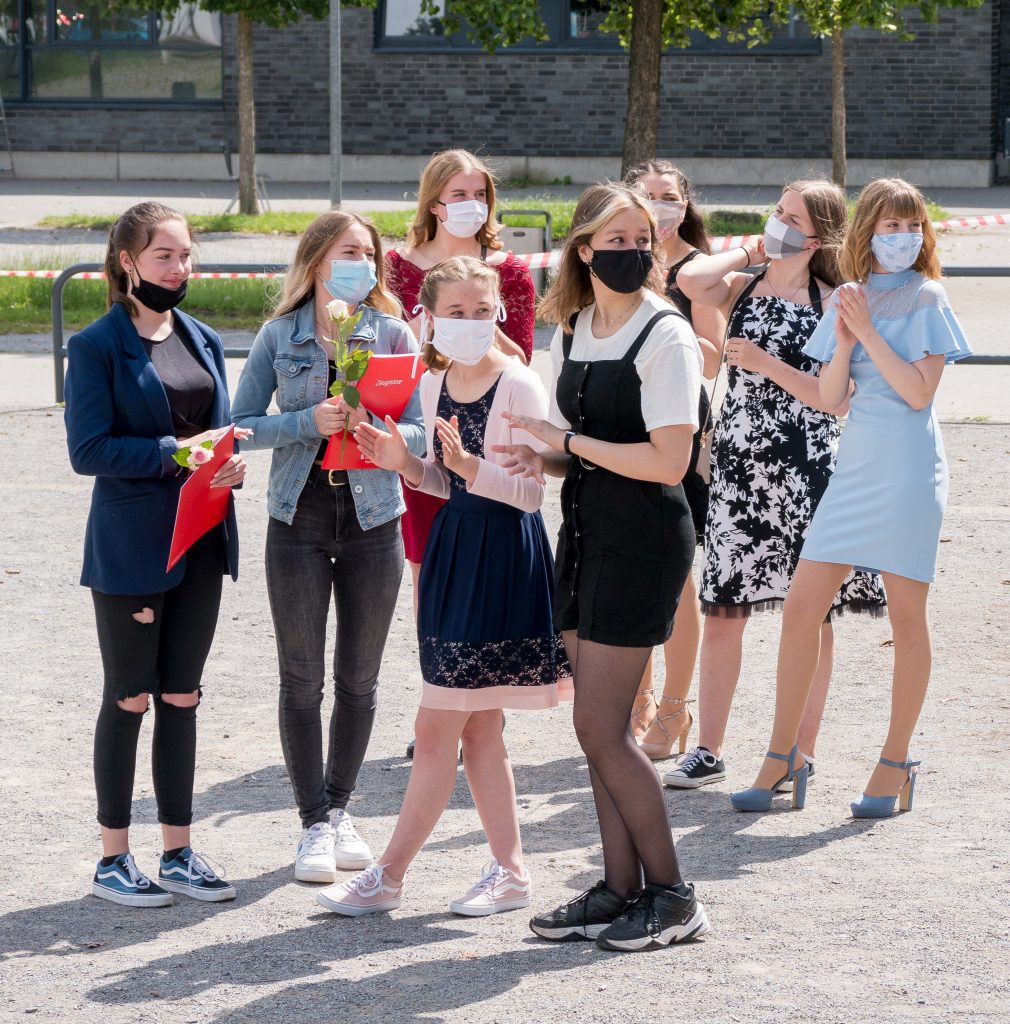Wegen der Hygienemaßnahmen durch die Corona-Pandemie fand die Zeugnisübergabe mit begrenzter Teilnehmerzahl ausnahmsweise vor der Aula statt. Das Wetter spendete strahlenden Sonnenschein und so stellte sich doch etwas feierliche Stimmung ein. Bilder aus den sechs Schuljahren wurden gezeigt und einige bunte Ballons stiegen zum Himmel auf. Bei viele Gesprächen am Rande der Veranstaltung wurden noch einmal Erinnerungen aufgefrischt und über Zukunftspläne diskutiert. Auch ein Corona gerechtes Gruppenfoto gab es zum Abschluss.