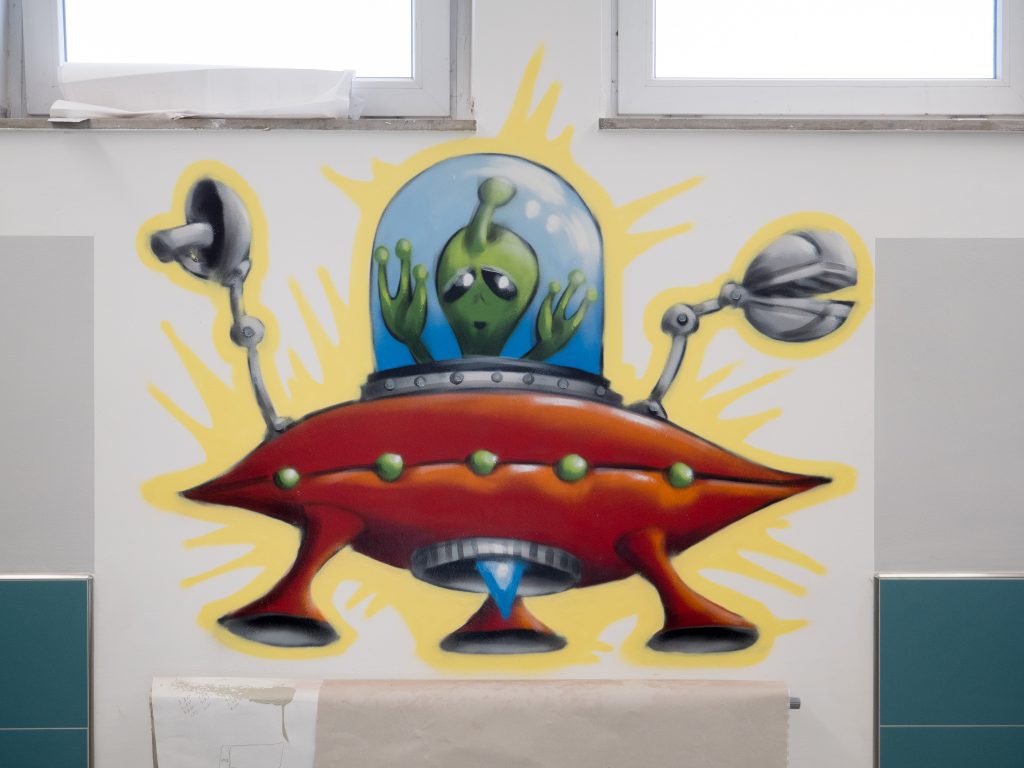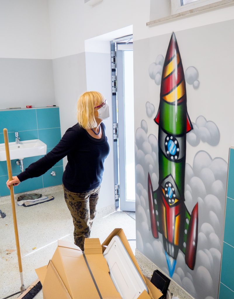 Frei nach Michelangelos Fresko „Erschaffung Adams“ gestaltete Greta von Gersum (links) aus der Jahrgangsstufe 11 ein originelles Szenario, welches sofort das Gefallen der Jury fand und jetzt die Mädchentoiletten am Schulhof ziert. Szenen aus dem Weltraum schmücken die Toiletten der Jungen. Der Entwurf dazu stammt von Max Eilhard (vorne) aus der Klasse 6c. Oliver Marke ist kein Unbekannter in Recklinghausen. Bis zu seinem Umzug nach Coesfeld lebte der 43jährige in der Festspielstadt. Seit zehn Jahren als freischaffender Künstler unterwegs hat er bereits ähnliche Projekte am Freiherr-Vom-Stein Gymnasium und an der Gudrun Pausewang Grundschule verwirklicht.