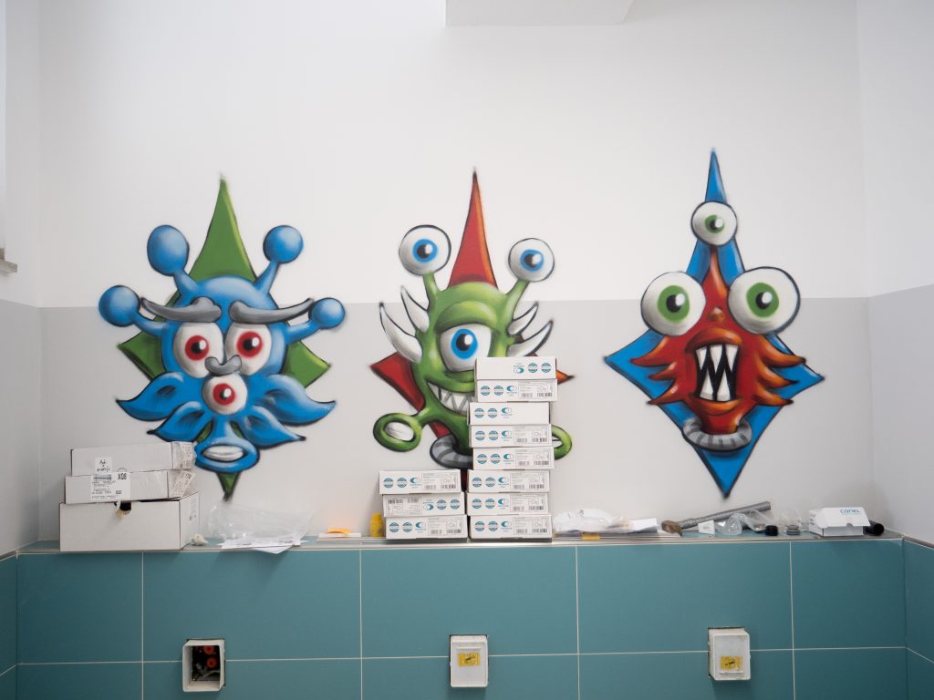 Das Werk ist vollendet. Seit dem Ende der Herbstferien zieren bunte Graffitis die renovierten „Stillen Örtchen“ der Gesamtschule Suderwich. Spray-Künstler Oliver Marke (rechts) verwirklichte die Kunstwerke nach den Entwürfen von Schülerinnen und Schülern. Vorangegangen war ein Wettbewerb, bei dem die Kinder und Jugendlichen ihre ganz persönlichen Ideen für die Gestaltung einbringen konnten. Keine leichte Entscheidung für die Jury, zu der neben Oliver Marke auch Lehrerin Gesa Müller und Architektin Cansu Buyruk von der Stadt Recklinghausen gehörten.