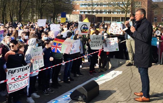 Verständnis, Liebe und Toleranz! Für diese Werte demonstrierten am 21. März 2022 Schülerinnen und Schüler der Geresu. Unterstützt wurden sie dabei von Abordnungen vom Theodor-Heuss-Gymnasium und dem Alexandrine Hegemann Berufskolleg. Nach einer Kundgebung mit verschiedenen, von den Jugendlichen gestalteten Beiträgen auf dem Schulhof zogen die etwa 1000 Demonstrantinnen und Demonstranten durch die Straßen von Suderwich. Bürgermeister Christoph Tesche war ebenfalls zu der Kundgebung erschienen und lobte das bürgerschaftliche Engagement der der Schülerinnen und Schüler.