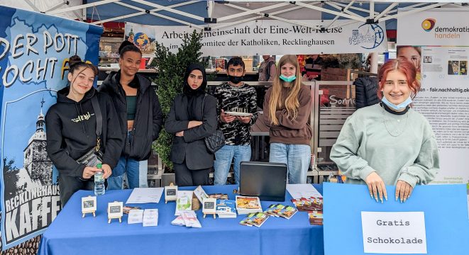 Wie viel Sklaven- und Kinderarbeit steckt in Ihrer Schokolade? Das fragten die Schülerinnen und Schüler unserer Schülerfirma FLaden die Kunden eines Lebensmittelgeschäftes am Rande der Recklinghäuser Innenstadt. Und da Kinderarbeit keinen Samstag kennt, wurde für Aktion ebenfalls ein Sonnabend, 24. September 2022, ausgewählt. Und so stand das FLaden-Team gemeinsam mit der AG Eine-Welt-Kreise Recklinghausen und einer Schülergruppe aus dem Gymnasium Petrinum einen Vormittag lang vor dem Supermarkt, informierte über ihre Arbeit und ihr Angebot nachhaltig produzierter Schreibwaren.