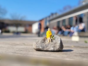 Jede Figur erhielt einen Namen, einen Beruf, persönliche Eigenschaften und Hobbys. Anschließend begaben sich die Schülerinnen und Schüler mit ihren Figuren auf fotografische Entdeckungsreise: Mal auf dem Schulgelände, mal an ganz anderen Orten entstanden kreative, witzige und farbenfrohe Fotos, die die jeweilige Figur in ihrem „Alltag“ zeigen.